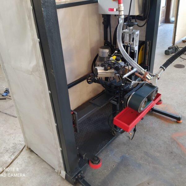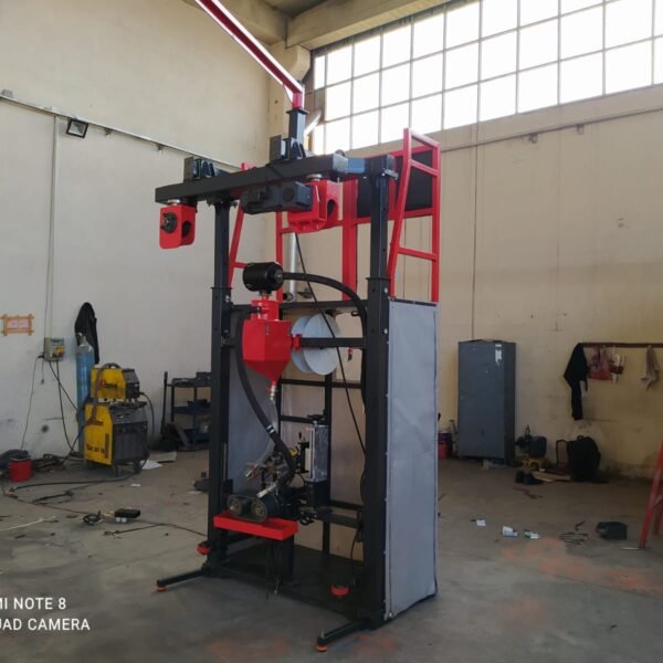 Asılı tip tank üzerinde yürüyebilme Tek taraflı tank kaynatabilme Tek operatör kontrolü 1000 – 3000 mm levha kaynatabilme Tank kaynak makinesi, yan pozisyonda (saat 3 istikametinde) tozaltı kaynak yöntemi ile kaynak yapabilen ve silindirik yapıların kaynak işlemlerinde kullanılabilmesi için dizayn edilmiş otomatik tank kaynak makinesidir. Kaynak ünitesi bir kabin üzerine sabitlenmiş durumdadır. Operatör için tüm emniyet koşulları sağlanmış olan bu kabinin üst katında sistemi donam sacı üzerinde hareket ettiren motor ve dişli sistemleri bulunmaktadır. Tank Kaynak Makinesi, büyük depolama tanklarının Tozaltı kaynak makinesi ile yatay çevresel kaynağın yapılabilmesine olanak sağlamaktadır. • Kaynak yapabileceği en düşük çap 4,5 metredir. • Kaynatabileceği en düşük sac kalınlığı ise 6 mm’dir. Dış kaplaması kullanıcıyı doğanın dış etkenlerinden koruyacak biçimde üretilmiştir. Tank Kaynak Makinemiz ister içten ister dıştan kaynak yapabilmek üzere tasarlanmıştır. Tank Kaynak Makine sisteminde ESAB A2S + PEK + LAF1001 tozaltı kaynak makinesi seti kullanılmıştır. İnvertör hız kontrol ünitesi sayesinde ideal kaynak hızı 0-600 mm/dk aralığında ayarlanabilmektedir. Tekli ve çiftli olarak iki ayrı model seçeneğine sahip olup, böylece ister tek makine ile yalnız tank içinden veya dışından; çiftli makine ile tankın hem içten hem dıştan aynı anda iki bölgesini kaynak yapabilme özelliğine sahiptir. Makinemiz tank yüzeyine paralel olarak min. 1500 mm ile maks 2500 metre aralığında kaynak yapabilme özelliğine sahiptir. ( İstenildiği takdirde opsiyonel ölçü aralığı vardır). Elektrik panosundan alınan 220 voltluk çıkış sayesinde, ihtiyaç duyulabilecek elektrikli aletlere enerji sağlanabilmektedir. Makine etrafında bulunan özel kaplama (alev yürümez branda) sayesinde operatörü doğa etkilerinden koruma özelliğine sahiptir. Makine üzerine adapte edilen 125 – 250 kg kapasiteli calaskal yardımıyla tozaltı sarf malzemelerine ve diğer malzemelere operatörün kolay erişilebilmesini sağlamaktadır. Torç bağlantısı ve ön dayama toplarının bulunduğu bölüm makineye salıncak sistemi ile yataklanmış ve alt kısmında bulunan yay ile hassasiyeti artırılmıştır. Böylece hem torç ve dayama toplarının sürekli saca baskısı sağlanmış, hem de kaynak esnasında herhangi bir çıkıntı olması halinde makineyi sarsıntı yapmadan sadece torç mekanizmasının hareketi ile sönümlemesi sağlanmıştır. Sistemimizde bulunan ve ön dayama toplarının saca baskısını ayarlamak için kriko sistemi kullanılmıştır. Böylece dayama toplarının saca istenildiği kadar baskı yapılmasına imkân sağlamaktadır. Makinemizin saç parçalarının genişliğine göre ayarlanmasında aşağı – yukarı kriko sistemi kullanılmıştır. Kriko sisteminin hareket tahriki redüktör – motor grubu sayesinde sağlanmaktadır. Makinemiz üzerinde bağlı pürmüz sayesinde kaynak parçalarının ön ısıtma (tavlama) işleminin yapılmasına imkân sağlamaktadır. Makinemizin iş parçası üzerinde hareketi tahrikli ve avare tekerlekler sayesinde sağlanmaktadır. Hareket tahriki ise motor-redüktör akuplesi sayesinde sağlanmaktadır. Ayrıca makineyi iş parçasına paralel durmasını sağlayan alt kısımda kriko sistemli dayama tekerlekleri bulunmaktadır.
